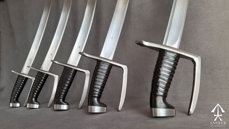 It has an elegant waisted grip and octagonal pommel (acid-resistant). Its light blade with historically accurate parameters closely matches those seen in original swords (and feders). Please remember that not only weight and Point of Balance (PoB) but also Pivot Points (Front – FPP and Aft – APP) and Center of Percussion (CoP) are essential, if your goal is to recreate good swordmanship, not “HEMA sport fencing”